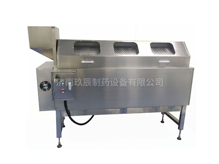 該機(jī)可單機(jī)使用也可與制丸機(jī)和提升機(jī)配套使用,提升機(jī)將成品藥丸提升后經(jīng)溜槽進(jìn)入旋轉(zhuǎn)的滾筒篩內(nèi),三節(jié)滾筒篩在主動(dòng)摩擦膠輪的帶動(dòng)下,順時(shí)針旋轉(zhuǎn),分別選出符合要求的各種丸劑。在篩選的過(guò)程中會(huì)出現(xiàn)丸劑直徑正好與篩孔大小一致的情況,丸劑夾在篩孔上,這時(shí)安裝在滾筒篩側(cè)邊的滾刷或硅膠壓輥能將藥丸擠出。
