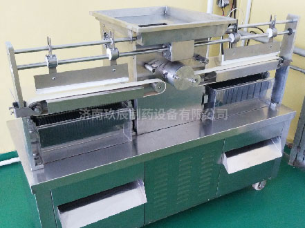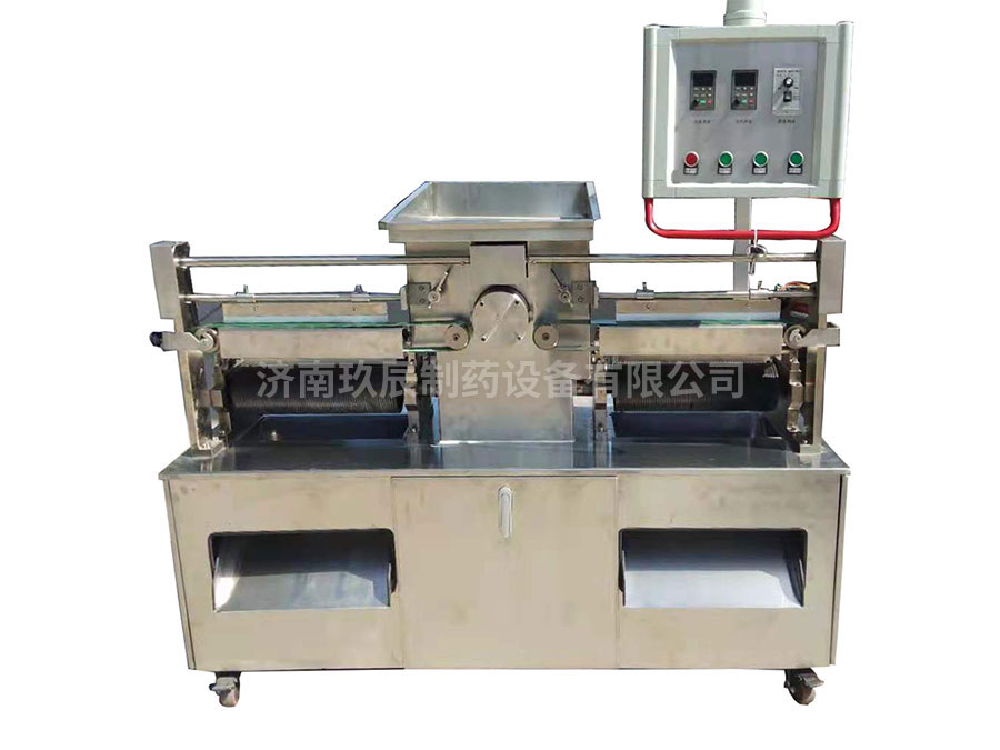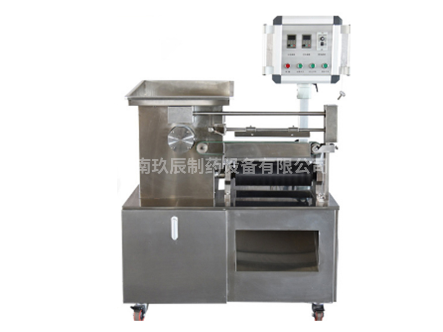 將混合、煉制均勻的藥料膏坨送入制丸機(jī)料斗中,通過(guò)翻板翻轉(zhuǎn)擠壓,在推進(jìn)器的作用下,藥條由兩側(cè)料嘴擠出。當(dāng)藥條到達(dá)一定長(zhǎng)度時(shí),由自動(dòng)切刀切斷,再由分配器將藥條送入搓輥。輥刀的位置和輸送帶松緊可分別通過(guò)微調(diào)裝置進(jìn)行調(diào)整,改變丸粒大小和重量可通過(guò)更換相應(yīng)規(guī)格的制丸刀輥實(shí)現(xiàn),操作方便。